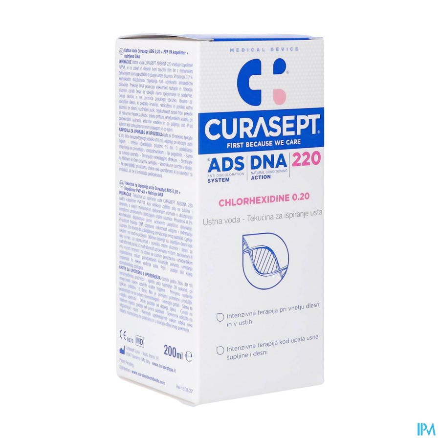 Curasept ADS DNA 220 0,20 % CHX est un bain de bouche puissant sans alcool contenant 0,20 % de chlorhexidine, spécialement développé pour une hygiène bucco-dentaire intensive et pour favoriser la régénération des gencives. Grâce à la technologie unique ADS® (Anti-Discoloration System), le risque de coloration des dents et d'altération du goût, effets secondaires fréquents de la chlorhexidine, est considérablement réduit.